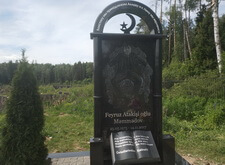 Собираем лавочку, устанавливаем её напротив надгробья. Цветник у подножья мемориальной стелы наполняем светлыми камнями. Под полукруглую арку памятника укрепляем вырезанную из гранита фигуру полумесяца.